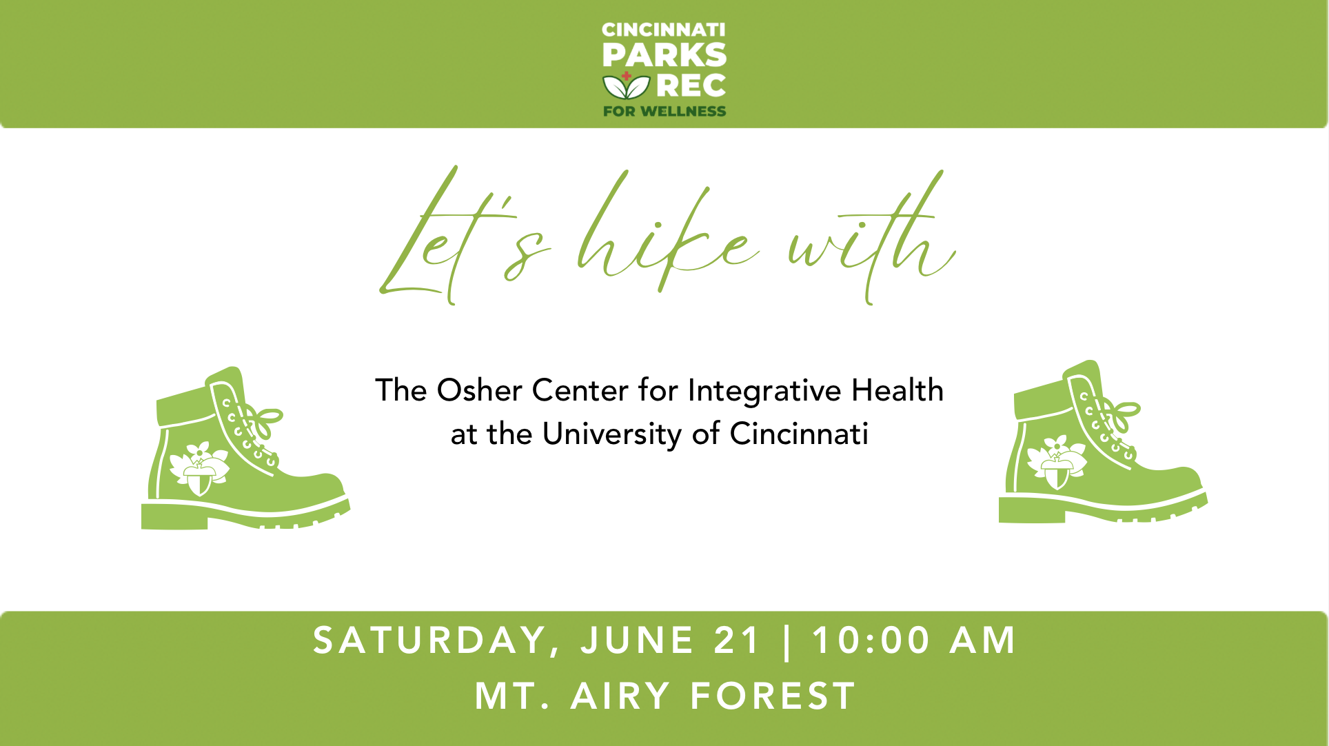 All are welcome to join team members from the Osher Center for Integrative Health at the University of Cincinnati for a hike through Mt. Airy Forest, starting at 10am. Meet at the Treehouse!