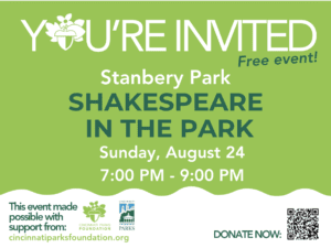Experience the magic of live theater under the stars at Stanbery Park’s Shakespeare in the Park, a cherished annual tradition in Cincinnati’s Mt. Washington neighborhood. Presented by the Cincinnati Shakespeare Company and supported by the Cincinnati Parks Foundation, this free, family-friendly event brings timeless works of the Bard to life in a beautiful outdoor setting.